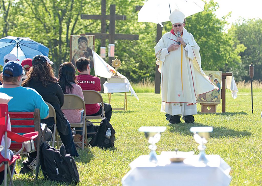 The lawn in front of the altar, which the archbishop referred to as the “green cathedral,” was filled with Brothers and Sisters of the Community of the Lamb, young adult pilgrims and parishioners of Sacred Heart Church in nearby Mound City.