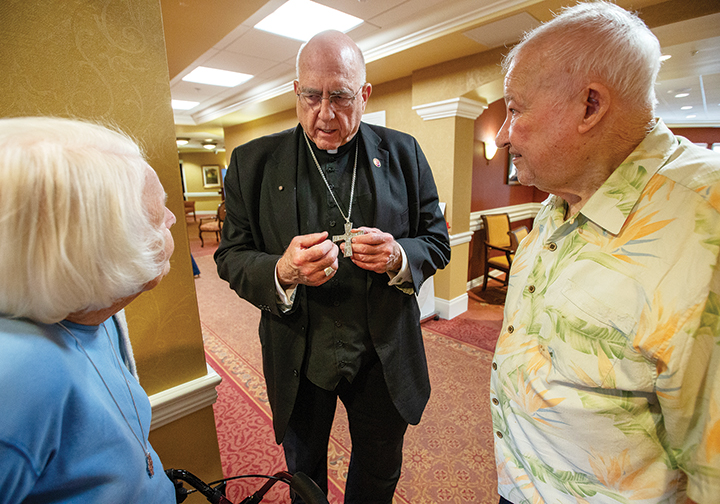 Archbishop Joseph F. Naumann visits with Santa Marta residents Martha McGrath and Leo Rieke as he tours the facility. LEAVEN PHOTO BY JAY SOLDNER