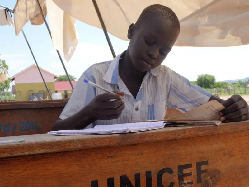 A student at the Sant’Egidio School takes notes in 2015 during a break from class in Adjumani, Uganda. For the hundreds of South Sudanese refugee children settled into a Ugandan camp, learning how to react without violence is as much a part of their school work as academic pursuits.(CNS photo/courtesy Sister Grace Candiru)