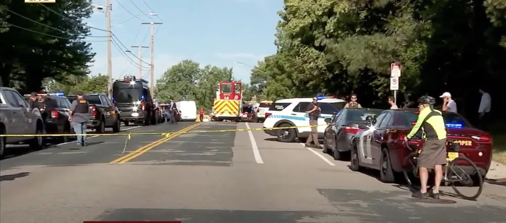 Police tape blocks off the road near the crime scene following a shooting at Annunciation Catholic School in Minneapolis Aug. 27, 2025. The Richfield Police Department is reporting there are up to 20 victims and the shooter is dead. (OSV News photo/YouTube)