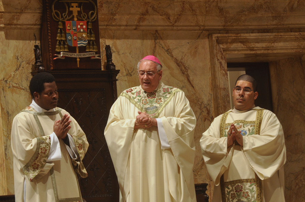Bishop Nicholas DiMarzio of Brooklyn, N.Y., flanked by Dominican-born Deacon Jose Henriquez and Haitian-born Deacon Yvon Aurelien, celebrates a special Mass June 24 at St. James Cathedral-Basilica in Brooklyn to pray for a resolution to the Dominican Republic’s threat to deport Haitians from that country. (CNS photo/Ed Wilkinson, The Tablet) See MASS-HAITIANS July 2, 2015.