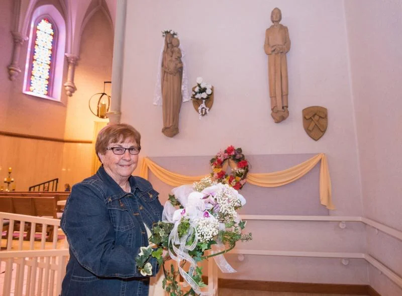 Her parents, Jack and Viola Reynebeau, owned and operated the florist business that they had started in 1935. “My mother did the orchid as a wrist corsage because the arms of the statue were extended,” Mulry continued. “After the church was remodeled, the statue was hung on a wall. Now we do a pot of flowers to set at Mary’s feet.”