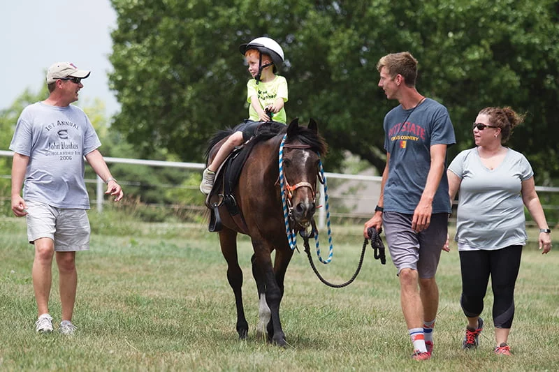 It’s all smiles as Luke Musick, 7, from Olpe rides his horse alongside his parents, Darin and Elaine, and camp counselor Matt Wilson. This is the archdiocese’s first-ever camp for families with special-needs members at Camp Tekakwitha in Williamsburg. LEAVEN PHOTO BY JAY SOLDNER