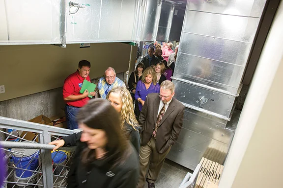 Usher Tim McDonnell (in red) watches as parishioners file out of the church’s mechanical room after an emergency preparedness drill at Holy Angels Parish in Basehor. Photo by Doug Hesse.