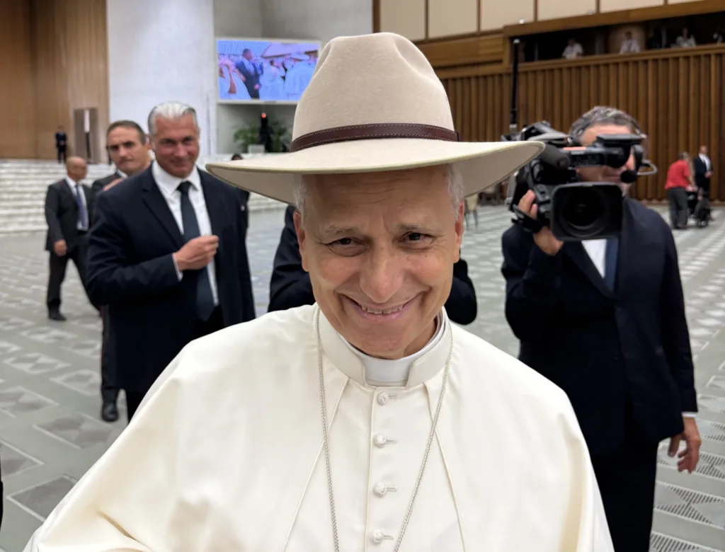 Pope Leo XIV poses with Australia’s iconic Akubra hat, gifted to him by Sydney newlyweds James Lu and Fiona Choi, following his weekly audience in Paul VI hall at the Vatican Aug. 13, 2025. (OSV News photo/courtesy James Lu via The Catholic Weekly)