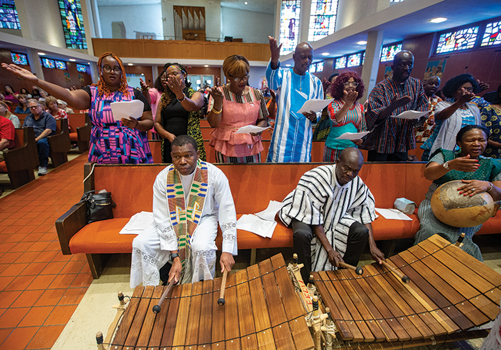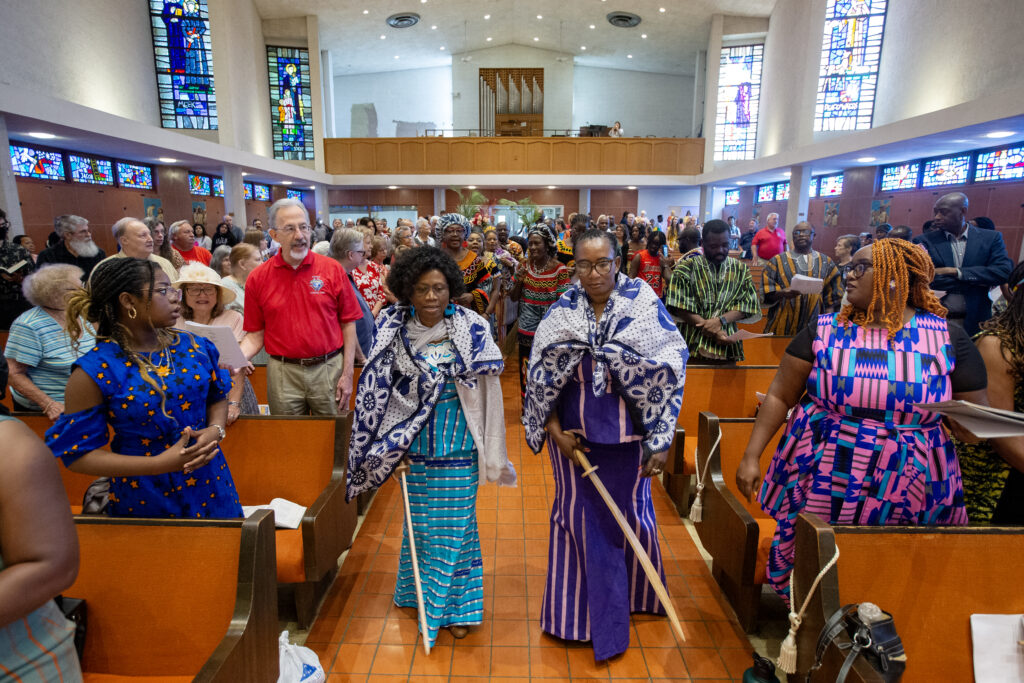 The liturgy includes moments that symbolize the evangelization of the Ghanaian people, like when members of the congregation prepare the way of the Gospel by sweeping the center aisle.