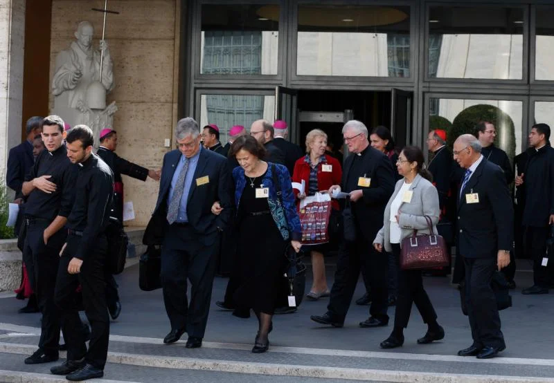 U.S. couple Anthony Paul and Catherine Wally Witczak, center, and other delegates leave a session of the Synod of Bishops on the family at the Vatican Oct. 15. The couple are observers at the synod. (CNS photo/Paul Haring)