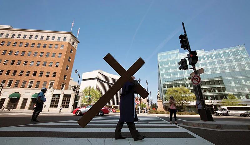 A man carries a cross during the Way of the Cross procession through the streets of Washington on Good Friday April 14. (CNS photo/Jaclyn Lippelmann, Catholic Standard)