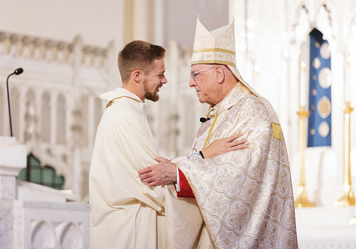 Will Sutherland accepts a hug from Archbishop Naumann as he was made a transitional deacon. Deacon Sutherland will serve at Good Shepherd in Shawnee this summer. PHOTO BY MARY KATE KRAUSE