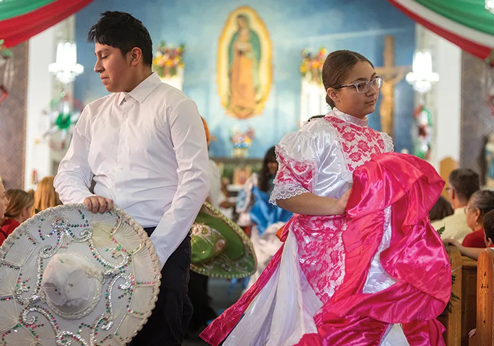 Sophia Meneses — as Our Lady of Guadalupe — and Jacob Torrez — as Juan Diego — act out the story of Our Lady of Guadalupe at Mass. The two are fourth graders at Holy Family School in Topeka. LEAVEN PHOTO BY JAY SOLDNERArchbishop Shawn McKnight celebrates Mass for Our Lady of Guadalupe Parish in Topeka on Dec. 12, the feast day of Our Lady. LEAVEN PHOTO BY JAY SOLDNERDancers Alex Antonio and A’raiya Vasquez don traditional Mexican attire as they take part in a folk dance in honor of Our Lady of Guadalupe. Alex and A’raiya are eighth graders at Holy Family School. LEAVEN PHOTO BY JAY SOLDNER