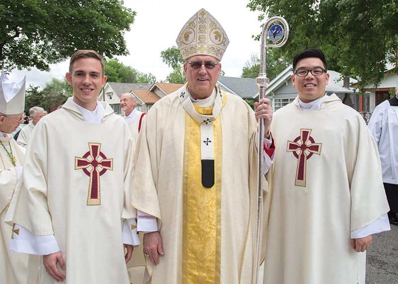Archbishop Joseph F. Naumann stands with newly ordained transitional deacons Justin Hamilton, left, and Viet Nguyen following their ordination on May 20 at the Cathedral of St. Peter in Kansas City, Kansas. PHOTO BY LABADIE COMMUNICATIONS
