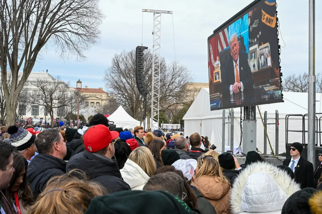 U.S. President Donald Trump is projected on a large video screen as he addresses attendees during the 53rd annual March for Life rally in Washington Jan. 23, 2026. (OSV News photo/Leslie E. Kossoff)