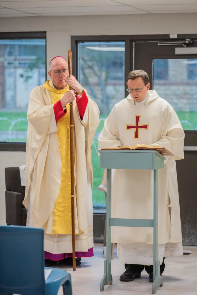 Deacon Timothy Ruoff reads the Gospel during a Mass celebrated by Archbishop Emeritus Joseph F. Naumann at the Topeka Correctional Facility during a visit in 2022. LEAVEN PHOTO BY KATHRYN WHITE