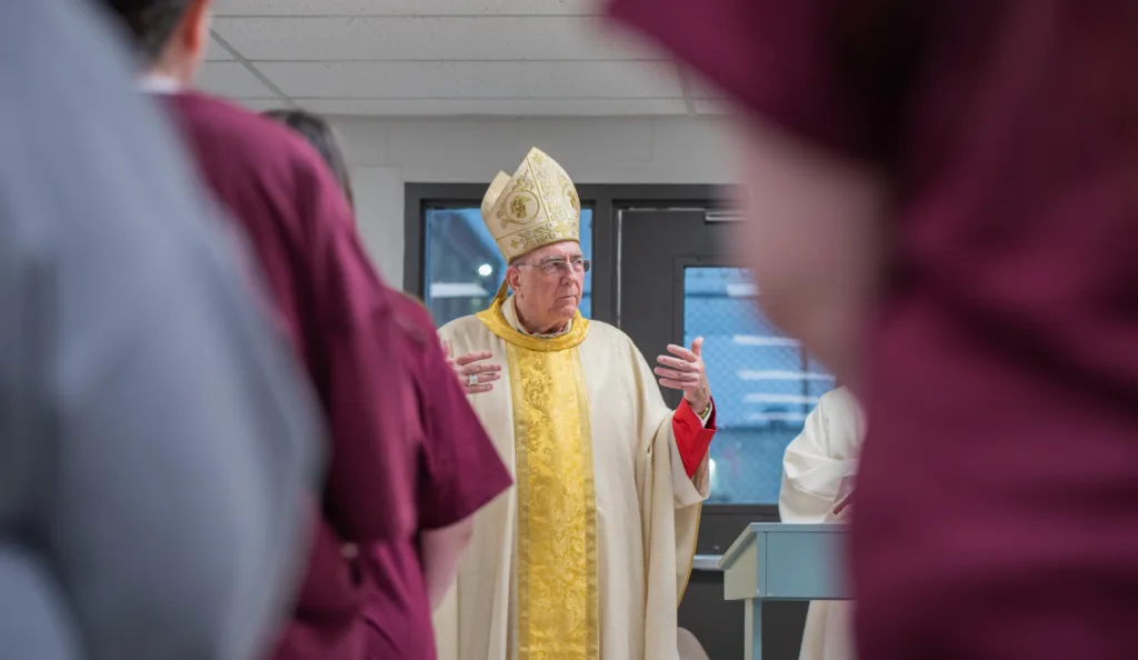 Archbishop Emeritus Joseph F. Naumann delivers a homily during Mass at the Topeka Correctional Facility in 2022. LEAVEN PHOTO BY KATHRYN WHITE
