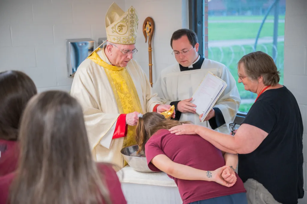 Archbishop Emeritus Joseph F. Naumann baptizes a woman incarcerated at the Topeka’s Correctional Facility during a visit in 2022. LEAVEN PHOTO BY KATHRYN WHITE