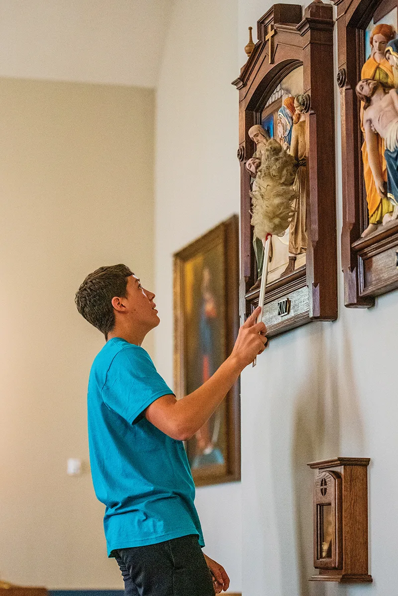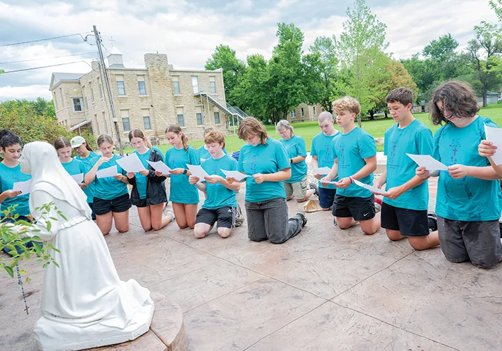 Each day began for this year’s group by meeting for either Mass inside the church or outdoor prayer at the on-site grotto. They then had breakfast and packed their lunches, which went with the kids to their job sites around the community.