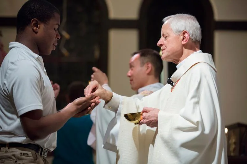 Cardinal Donald W. Wuerl of Washington gives Communion to a young man during the April 21 University Mass for Life at Epiphany Catholic Church in Washington, one day after Planned Parenthood’s president, Cecile Richards, gave a speech at nearby Georgetown University at the invitation of a student-led group. (CNS photo/Jaclyn Lippelmann, Catholic Standard)